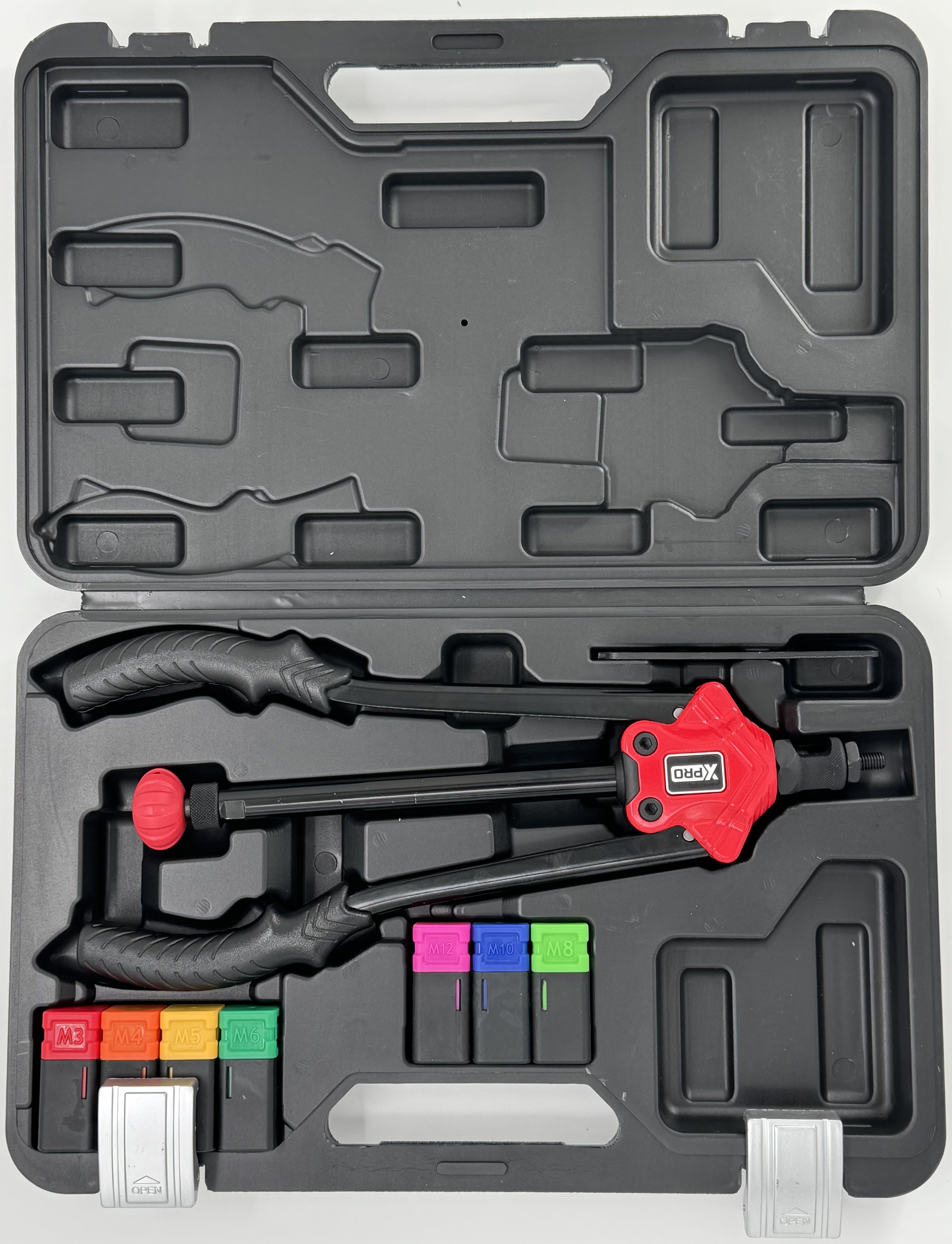 Ручной заклепочник для заклепочных гаек М3-М8 фирмы YATO YT-36112. Заклепочник предназначен для соединения материалов с помощью заклепочных гаек. Соединяет материалы с помощью втулки с внутренней резьбой. Это позволяет прикручивать дополнительные элементы саморезами по металлу или саморезами. Головки в размерах: М3, М4, М5, М6, М8. Изготовлен из прочной хромомолибденовой инструментальной стали CrMo. Ручки покрыты нескользящей резиновой подкладкой.