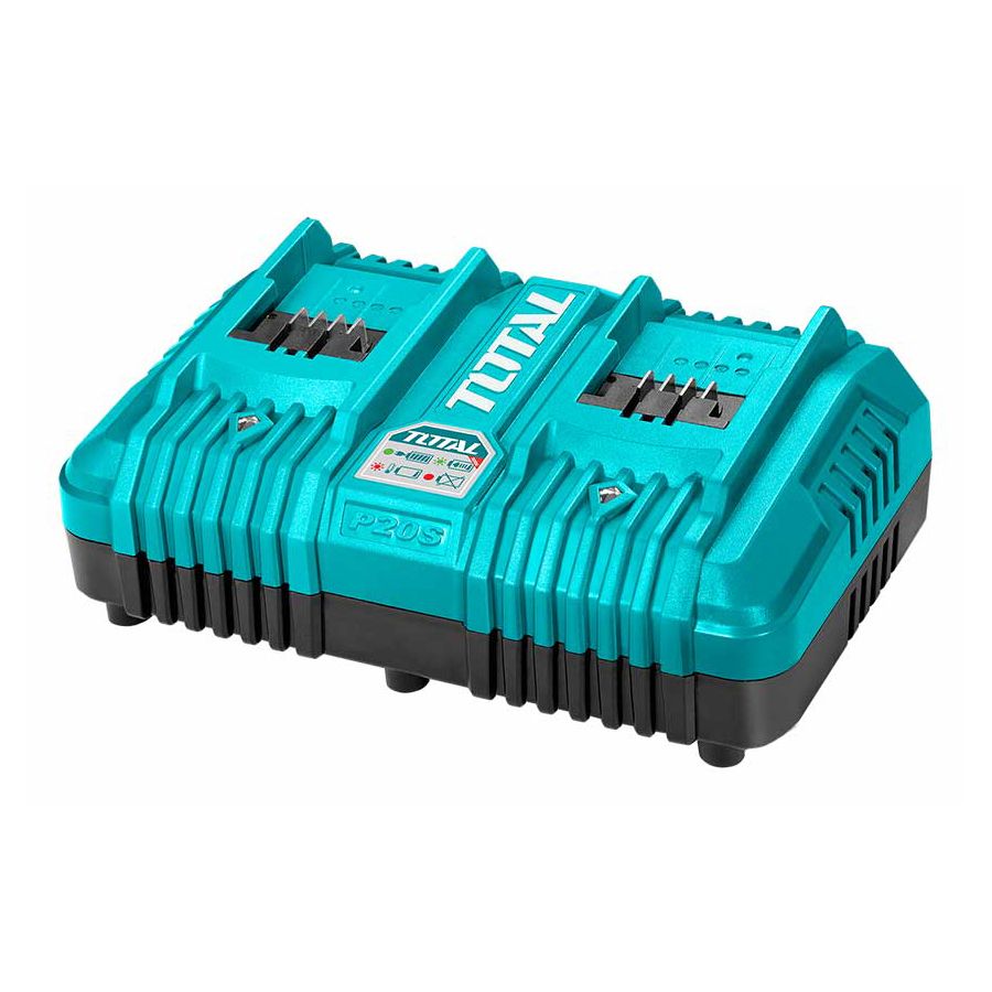 - Интеллектуальное зарядное устройство на 2 порта TCLI 2034 – высокотехнологичное устройство, в составе системы TOTAL P20S, включающей 120+ изделий, работающих от единого аккумулятора 20 вольт.