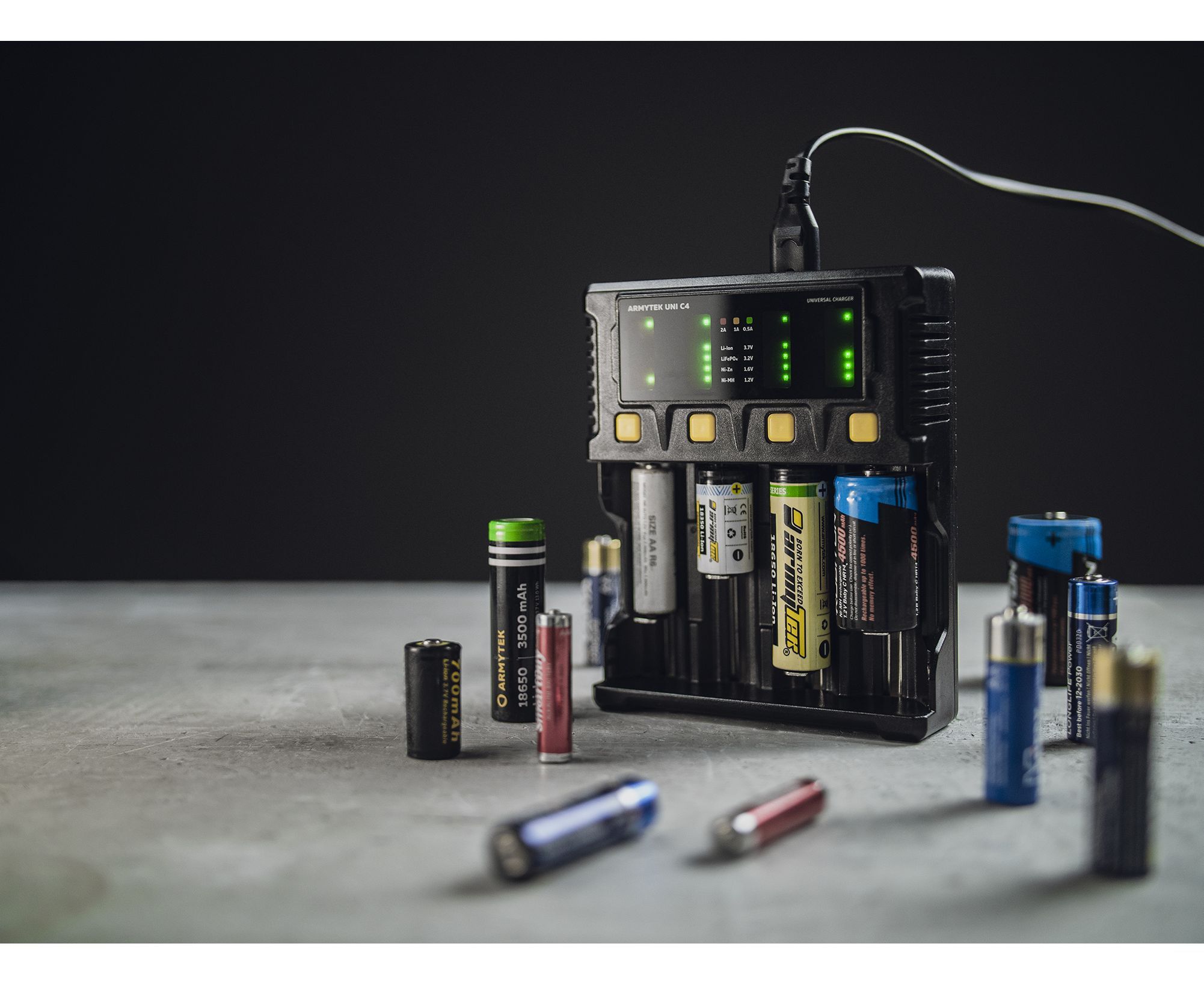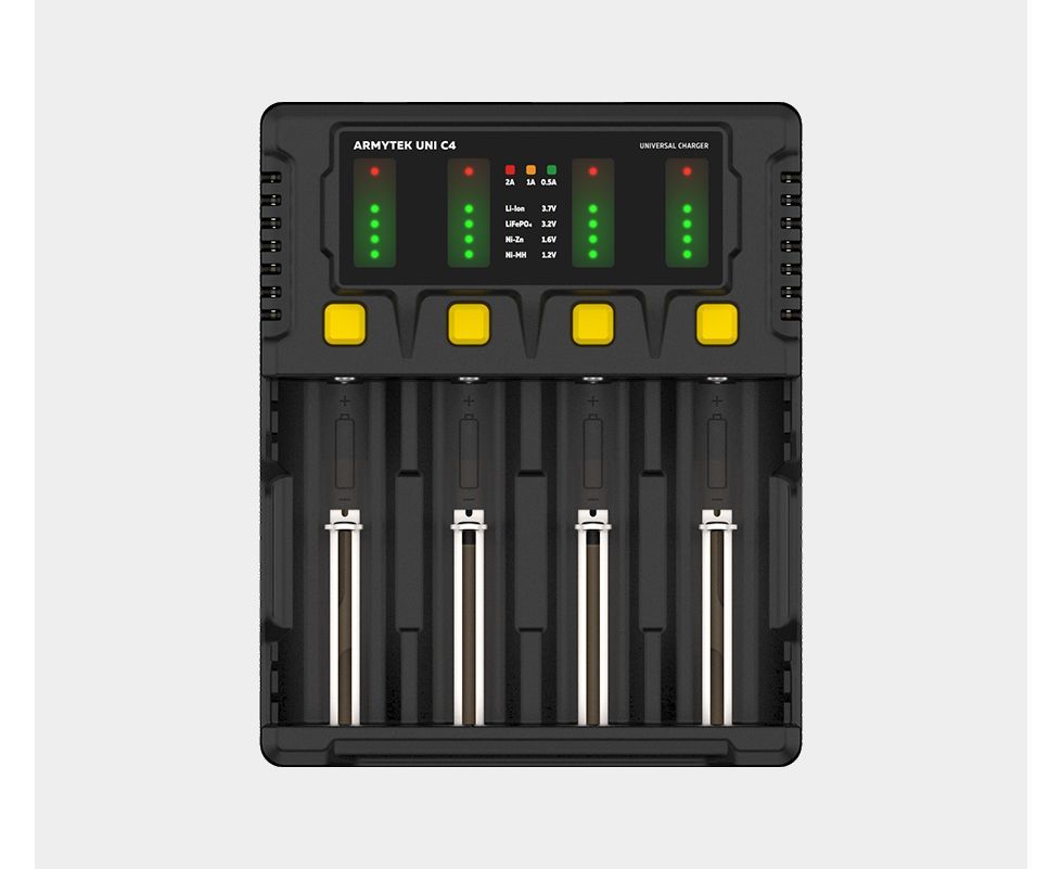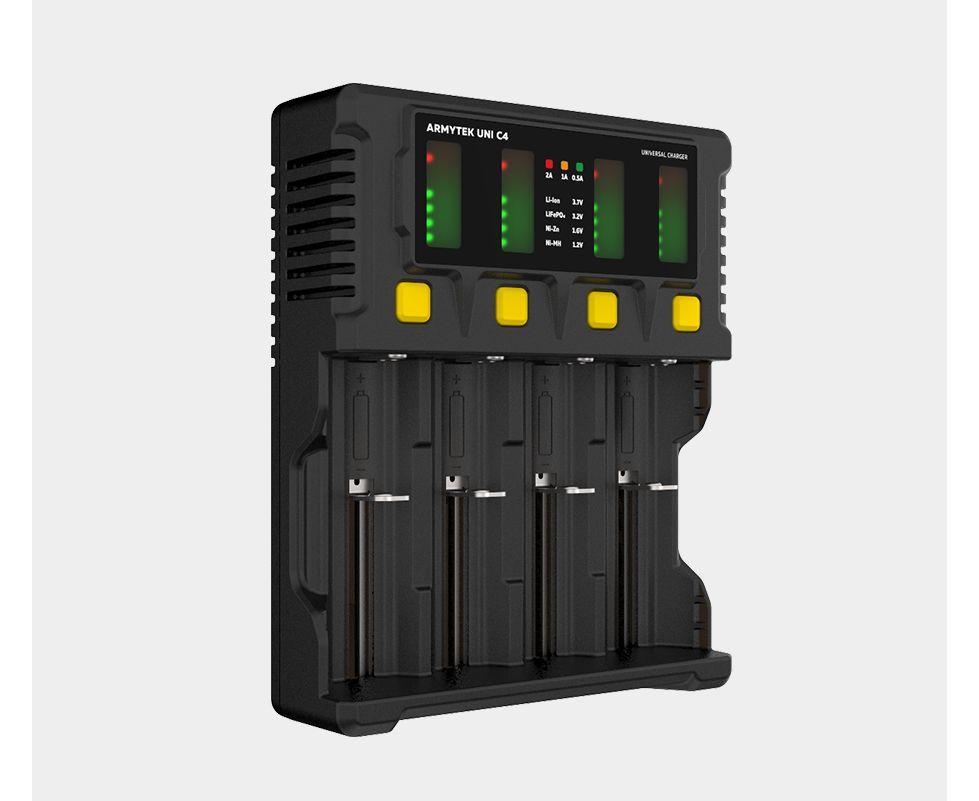Uni C4 – универсальное зарядное устройство с интеллектуальным автоопределением типа аккумулятора, уровня заряда и оптимального тока. Одновременно заряжает до 4 аккумуляторов разного типа током до 2А. Отдельная кнопка для каждого канала обеспечивает простое ручное управление. Автомобильный адаптер в комплекте.