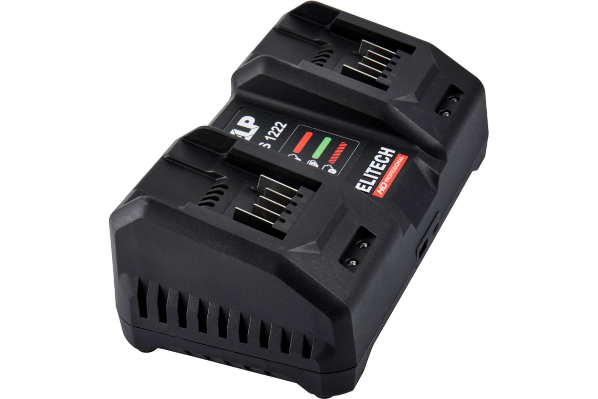 Зарядное устройство с двумя портами для Li-Ion аккумуляторов ELITECH напряжением 10,8-20 В слайдерной конструкции. Ток заряда 6 А.