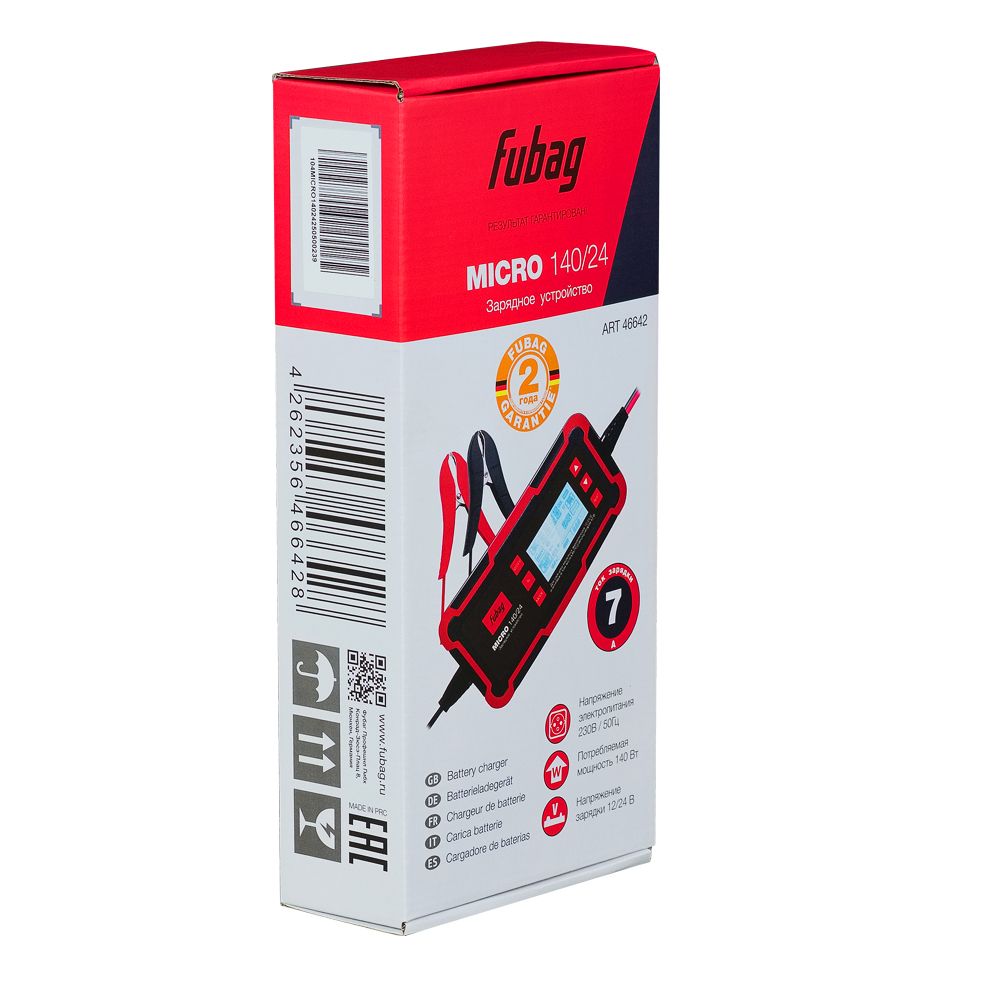 - Зарядное устройство FUBAG Micro 140/24 — это инновационное решение для зарядки различных типов батарей. Оно идеально подходит для свинцово-кислотных аккумуляторов на 12 и 24В, а также для литиевых батарей на 12В, включая LiFePO4. Это устройство способно заряжать аккумуляторы с емкостью до 230Ач, что делает его идеальным выбором для легковых и грузовых автомобилей, мотоциклов, автобусов, а также яхт и снегоходов.