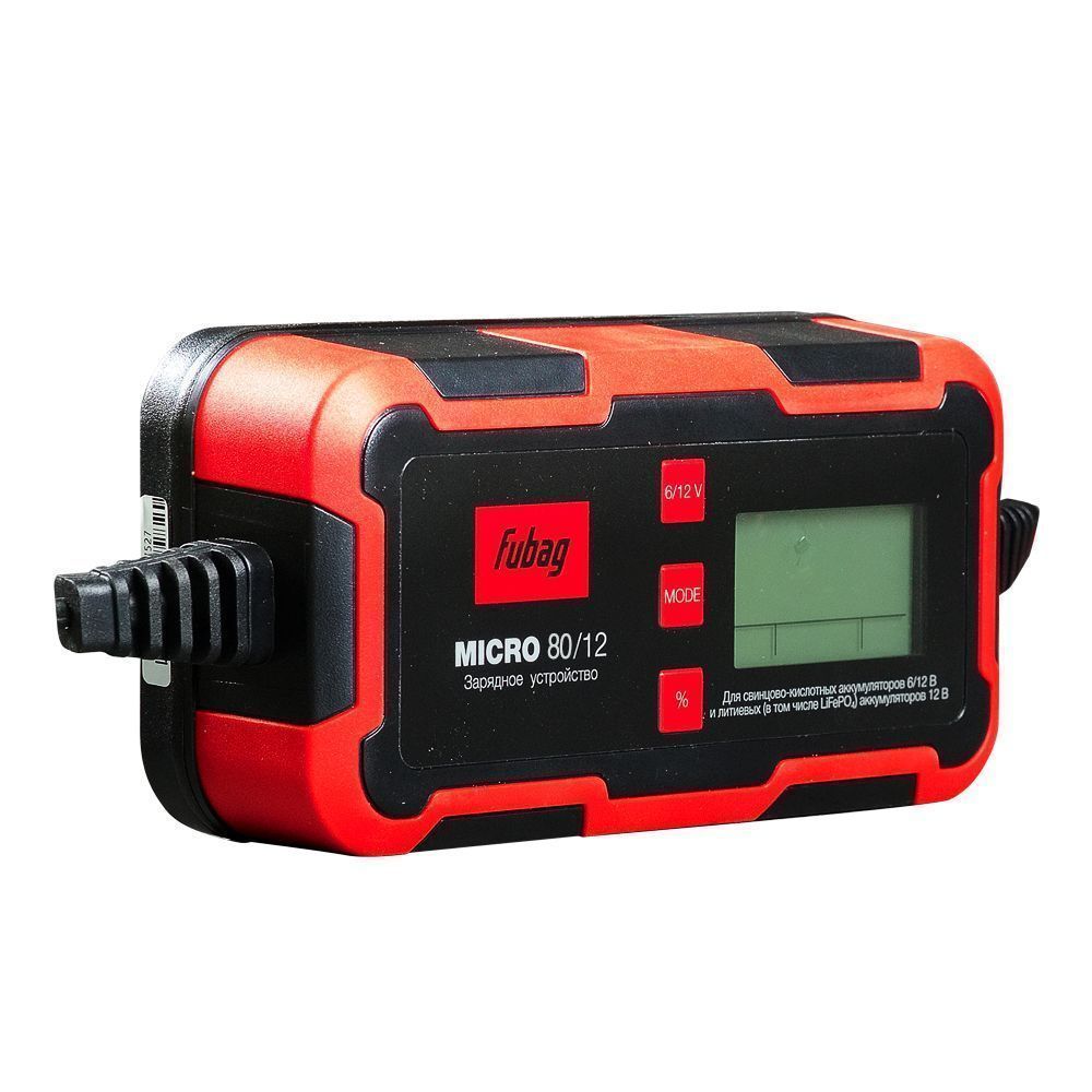 - FUBAG MICRO 80/12 — многофункциональное интеллектуальное зарядное устройство, созданное для обслуживания свинцово-кислотных аккумуляторов с номинальным напряжением 6 и 12 В, а также литиевых аккумуляторов 12 В, включая LiFePO4. Устройство способно заряжать аккумуляторы емкостью от 2 до 140 А·ч.