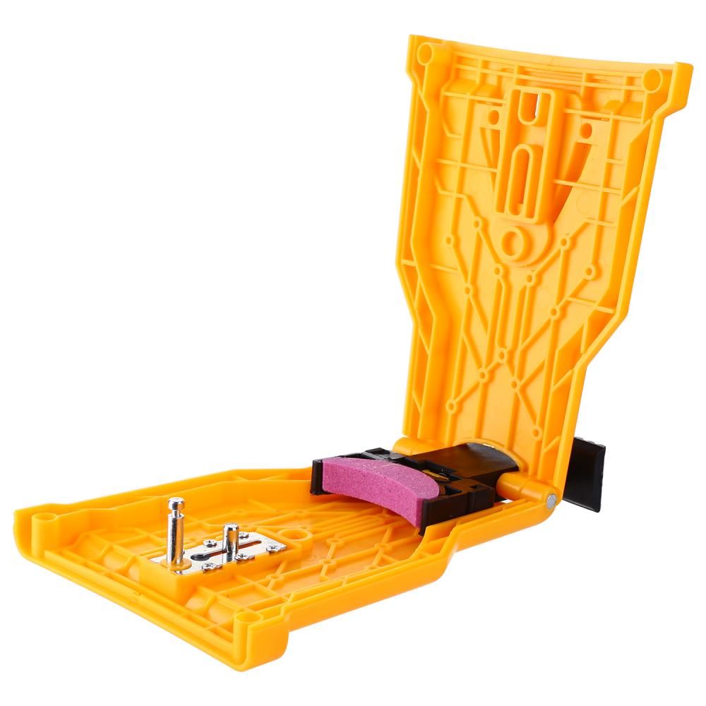 - Поместите пилу в корпус заточки, закройте и зафиксируйте.